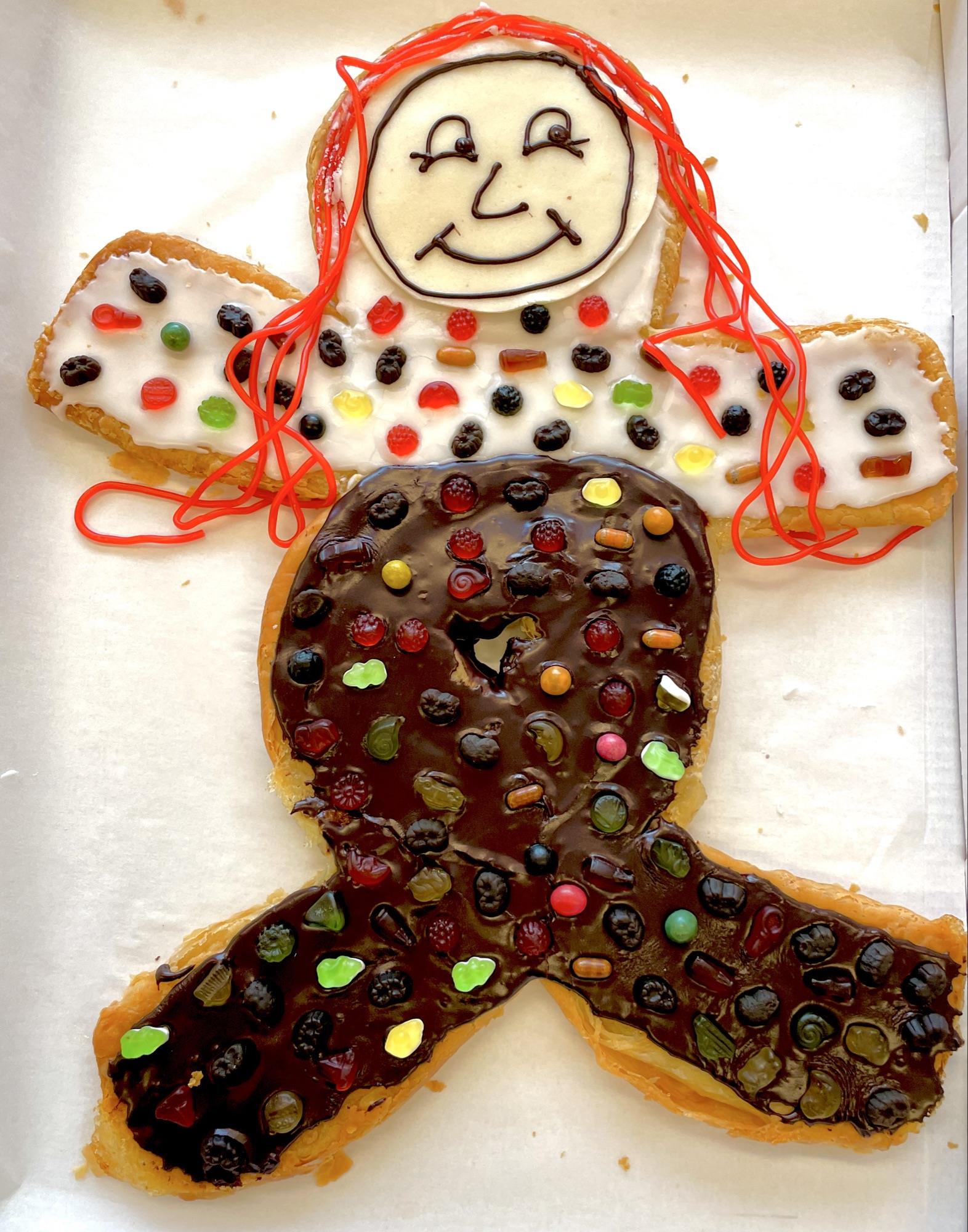 Wienerdejs-kagemand pyntet med to farver glasur, slik og marcipanbånd. På marcipanbåndet kan tilføjes en hilsen, fx navn og årstal eller ”Tillykke”. Det er helt op til dig. Skriv det blot i kommentarfeltet. Ideel til børnefødselsdagen.
